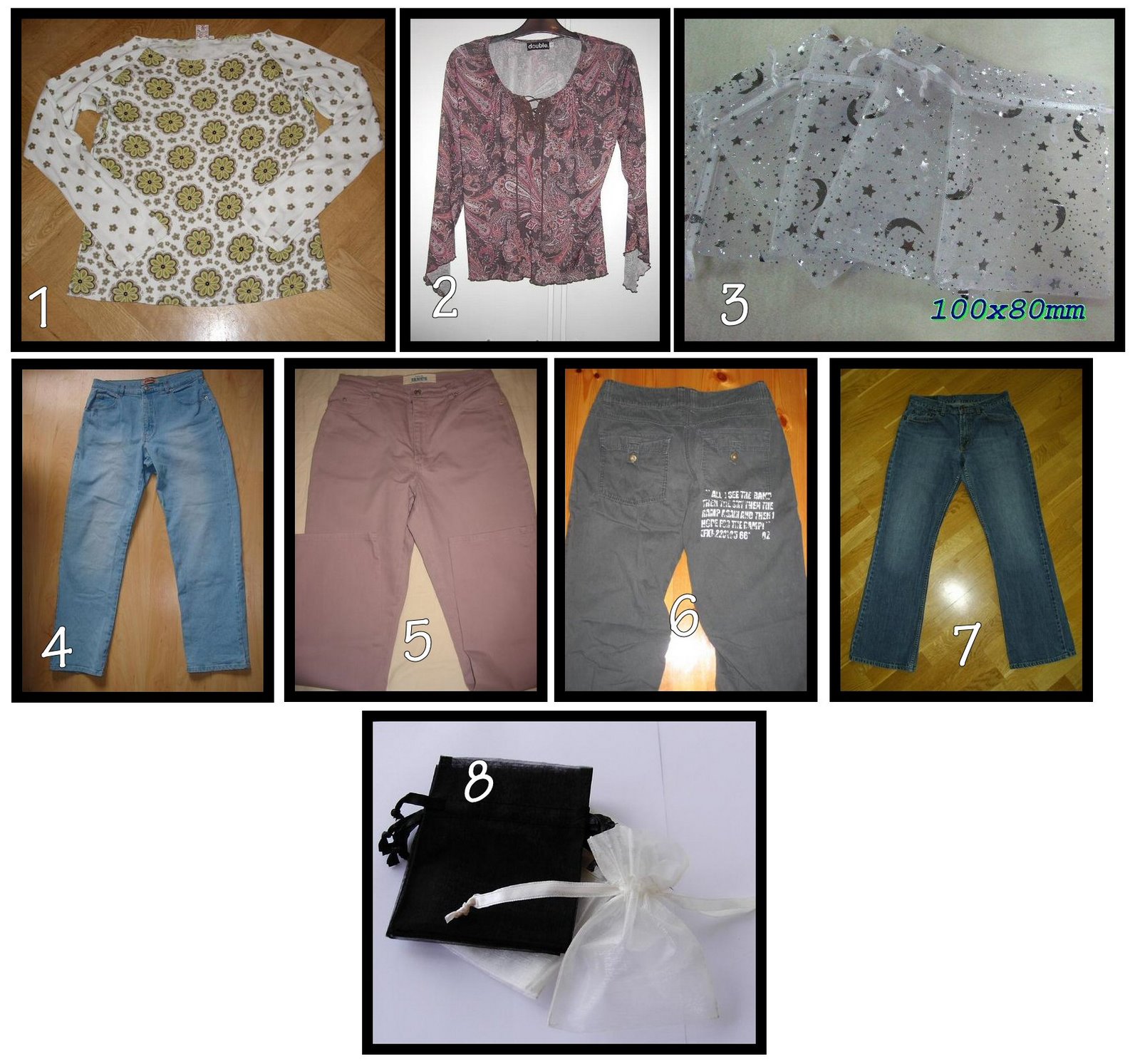 7. Jeans (för små, någon som vill köpa? gissar på stlk 38, för 34 tum är de inte)