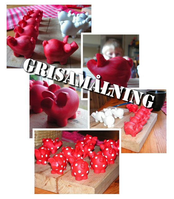 I år blir det en handmålad julgris med vita prickar 🙂 Målade allihop idag och imorgon blir det ögon och näsborrar och så skriver jag årtalet på… lägger in bild på resultatet…