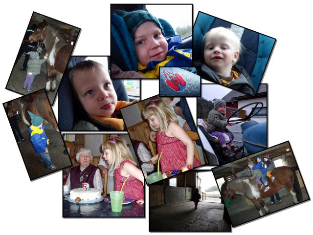 Kusinvitamin fläkte upp sina presenter och den virkade kaninen verkade gå hem… När vi fikat färdigt var det ”titta-på-hästarna” som gällde, redan hemma ville Ian åka traktor och Totte ville rida, så det var ju bara att ge sig ut och åstadkomma nåt i den här vägen.