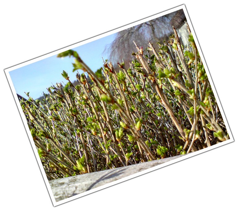 Vi satt där i goda 1½ timme och sippade kaffe och knaprade waffers med chokladsmak och bara njöt i sköna solen! På vägen dit såg jag att grannens häck börjar sätta löv, och höjde jag blicken lite så såg jag ju faktiskt att det mesta sätter löv nu…