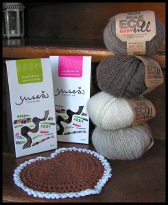 Vi promenerade Klammerdammsgatan ner och gick in till ”garntanten”, där hittade jag Eco Babyull, och det är ju både naturmaterial och ekologiskt, dessutom bara 25 gr i varje nystan så det blev fyra nyanser!! Det hade jag uppskattat i alla fall!! Så nu har jag både choklad och garn till det paket jag ska skicka iväg i den garn&choklad-bytar-klubb jag är med i… eller ja, man anmäler sig och så får man namn och adress att skicka till och så får någon annan min adress. Jag är MÄKTA nyfiken på att se vad jag får…