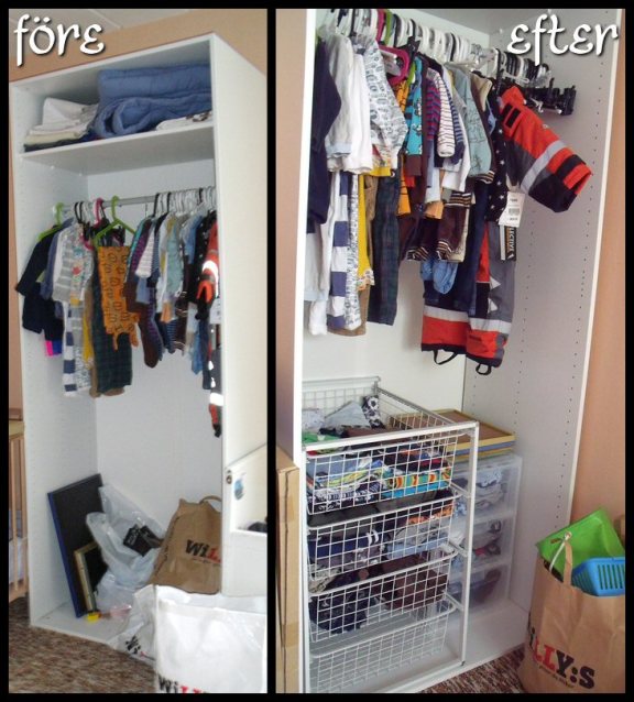 Det blev även en förvaringskonstruktion (se bilden nedan) på Biltema… Nu är garderoben komplett, förutom att de jäkla garderobsdörrarna fortfarande krånglar… förut var det skruvar som var borta, nu är skruvar fixade, men då är plugghålen för stora så vi måste ha andra plugg *suckar* det ser ju så rörigt ut när det inte är dörrar på garderoben…