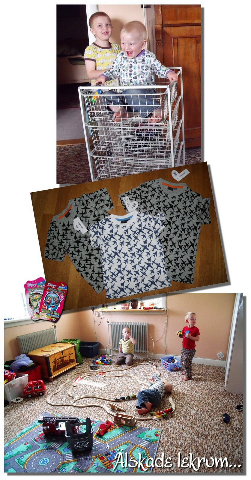 Jag kom ut med 3 t-shirts till ungarna, nu är jag inte en sådan som gillar att klä mina barn lika men ibland så gillar de att vara lika klädda… så det blev 2 grå och en vit t-shirt med flygplan på. Det blev även spindelmannentvål till killarna och glittriga hårspännen till mig.