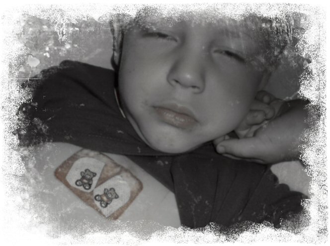 Han gnällde flera gånger om att nålen gjorde ont… tills jag förklarade att det bara var en slang i armen, nålen låg i en plastbytta långt ifrån honom… Då lugnade han sig…