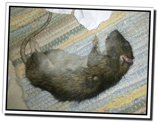 Vi har under någon vecka haft lite problem här… problemen är små, äckliga och ludna… Vi ska imorgon påbörja operation ”utrota” men katten började redan ikväll. En välväxt, ganska stor råttpojke som fick statuera exempel för vad som händer med vilda råttor i det här huset… Antagligen samma råtta som maken höll på att få i ansiktet härom kvällen, när han böjde sig ner vid diskmaskinen för att se efter 😉