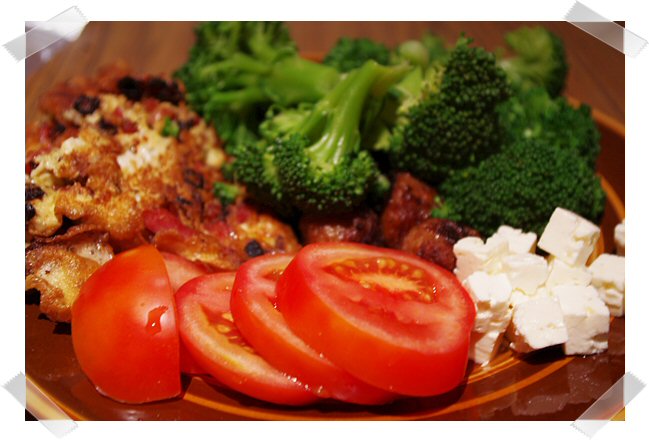 En omelett med tärnad bacon och lök (2 ägg), 5 st köttbullar, massa broccoli, en tomat och lite salladsost *burp* GI-menyn börjar ta ut sin rätt i kroppen.