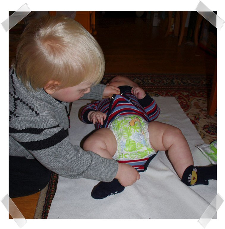 Idag fick jag assistans vid bajsblöje-bytet av Alfred, jag hann knappt få av Hannes byxorna innan Alfred hade knäppt upp body och blöja….