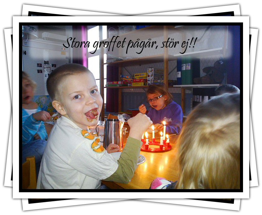 Barnen fick en lekstund och vi packade upp alltihop. Sedan började stora groffet! Marängsviss á la Svartlok, glass, grädde, banan, vindruvor, marsmallows, maränger, strössel, kolasås, chokladsås och ”hardtop”-chokladsås fanns det att tillgå.Barnen fick blanda precis som de ville och aldrig har väl 7 st 6/7-åringar suttit så tysta! Så det var nog gott…