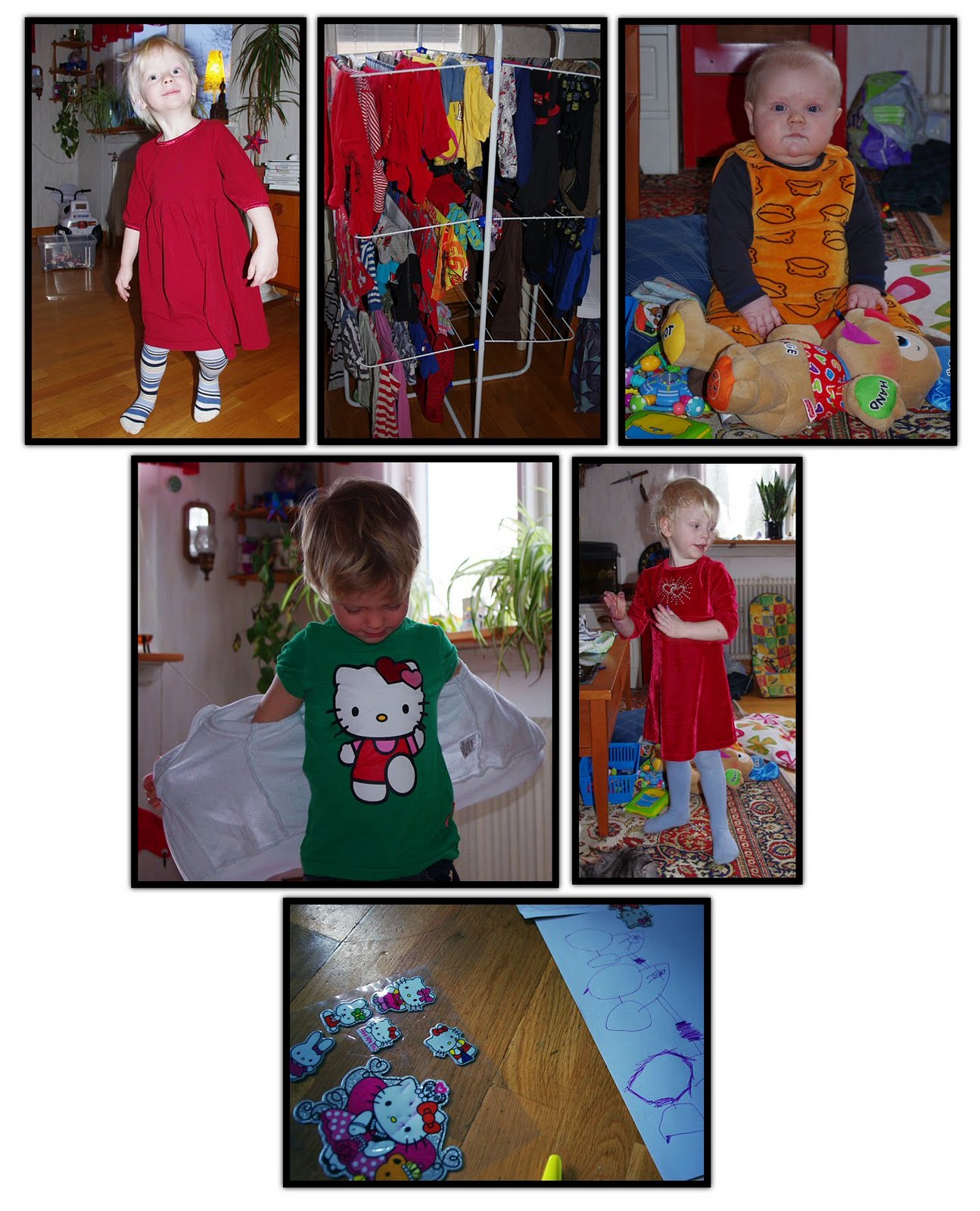 Övre raden: Alfred i sin älskade klänning, torkställningen för dagen, jag jobbar mig sakta men säkert från mörka och murriga kläder till ungarna och mot klara härliga färger! Hannes är väl mest unisex idag med sina sura grodor…