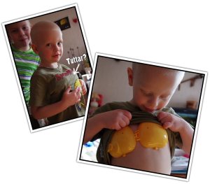 Jag tänkte ”hur har det här gått till”, tittade efter, asgarvade och så klart, hämtade kameran 😉 För ett tag sedan var vi på McD och de fick sådana där Hello Kitty-plasthistorier i sina boxar, den hade Alfred tagit och öppnat och stoppat in i tröjan…