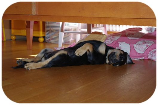 Nå, hur gick det här under första natten… Jodå, jag sov gott i sängen medan Teskedspappan kamperade på soffan inatt med toksovande valp på golvet ^_^
