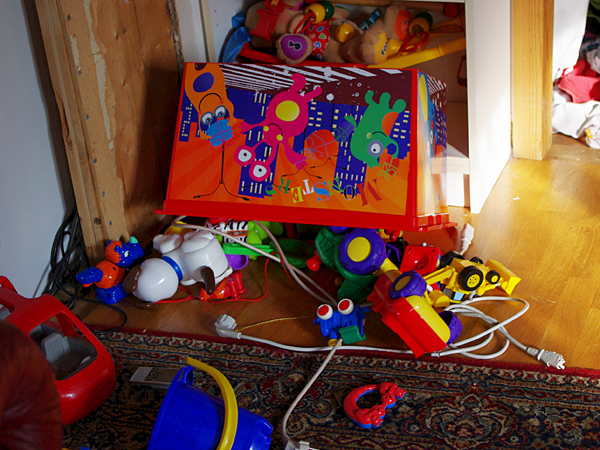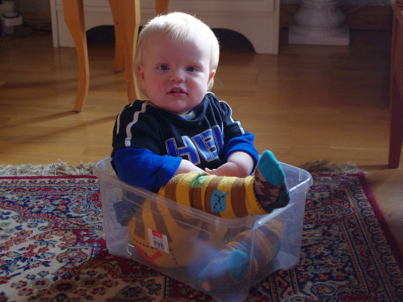 Nya leklådan har för höga kanter så han kommer inte i den *HA!!!* så han kontrade med att tömma den och välta upp och ner på den… antar väl att han snart kommer på hur han ska klättra upp på den istället