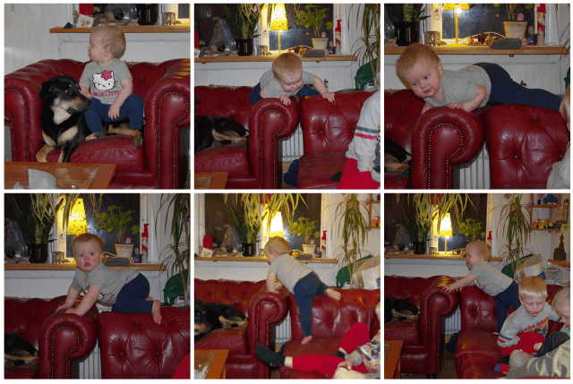 Hahaha, nä, jag är härdad 😉 han klarar det galant och sedan är det massor med garn i hörnet som dämpar om han trillar…