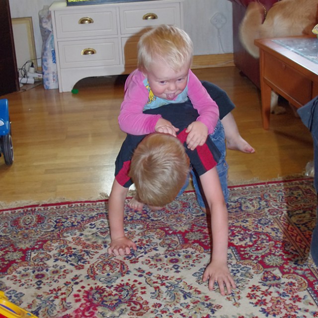 Det började med att Ludde bar Hannes på ryggen, och nu har det blivit så kul att så fort någon sätter sig på golvet så hänger han direkt på ryggen…