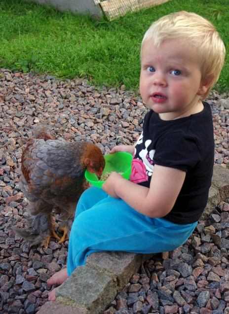 Hannes kör benhårt med sitt ”pippi” och ska mata höns, gäss, ankor eller Ettan, ja Ettan är ju en hönshjärna också men är väl mer kelgris än höna i dagsläget.