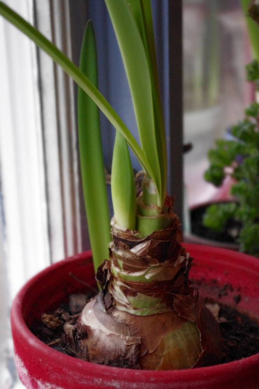 Vi är ju lite glömska okonventionella i det här huset, så mina amaryllis kom inte upp ut källaren förrän veckan innan jul och nu har alla tre kommit upp med blad! En har dessutom satt knopp och jag vet inte om det är den vita eller röda som kommit igång.