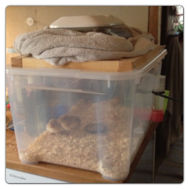 Det blev tre små dunbollar här i kläckaren och en under hönan i uthuset.
