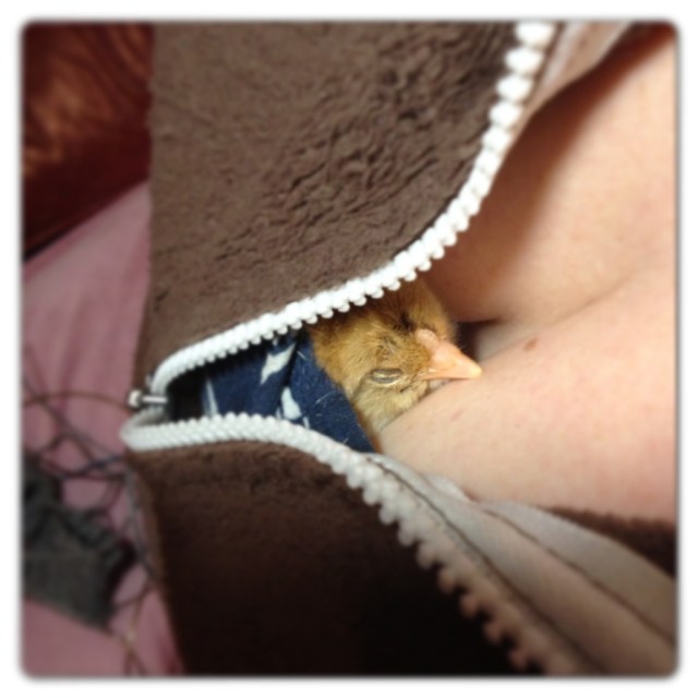 Den lilla kycklingen som kläcktes i min hand har definitivt blivit präglad på mig och är tyst när jag bär runt på den. Sitter den i lådan skriker den bara efter mig hela tiden…. Nu ikväll satt den i min bh och sov i 3 timmar…