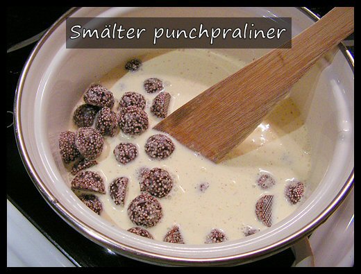Jag satte plattan på 2:an och hällde i praliner och grädde i kastrullen, sedan tog det 1 timma ca att smälta, rör med jämna mellanrum så det inte blir en tjock pralinkaka på botten. När allt hade smällt så hälde jag över allt i den bunken som jag tänkte vispa det i och så in i kylen till dagen efter. Då attackerade jag med elvispen och det här var nog bland den godaste fyllning jag har ätit!