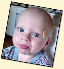 Idag hittade Alfred på en kul sak, när vi var hos ”Tijas” så kom han på att när smårgåsrånbitar blir kladdiga så kan man trycka fast dem i pannan *skakar på huvudet* den är ju klassens clown redan innan han ens har börjat dagis….