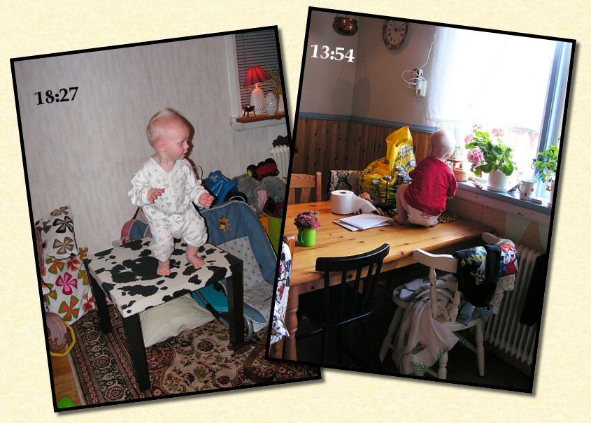 Det här var bara första av 4 vändor på bordet, snart tar jag bort köksstolarna, för han puttar ju ut dem och klättrar upp! Tips på hur vi ska göra mottages tacksamt, jag tappade min hjärna i golvet och nu vill den inte riktigt fungera… Att ställa stolarna på bordet fungerar inte och inte heller att tippa dem mot bordet, hunden välter dem över sig, och så kan vi inte ha det *testat*.