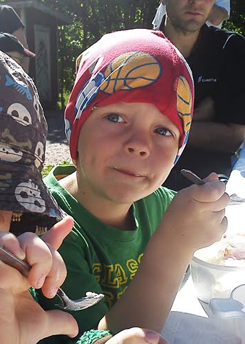Vi köpte fika på väg hem från skolbussen och ungarna fikar och Ian visar upp sitt korta hår, som han har dolt under en mössa… ovan vid vinddraget kanske…