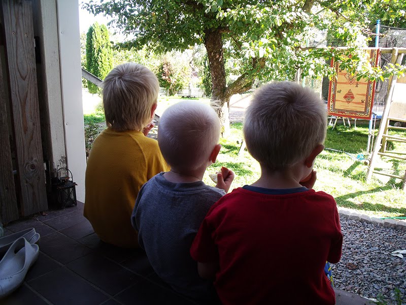Ian och Alfred är MYCKET medvetna om att det är strängeligen förbjudet att vara i ankdammen, ankorna basjar ju i vattnet och magsjuka pga klydd med förorenat vatten är inte min grej… 2 ggr idag har jag sanerat både Ian och Alfred… Ians andra gång var för att jag sa till honom att inte skita ner sig lika mycket igen (order ignorerad) så han kom in och var svart av lera hela han så det blev deprotering i trappan och utegångsförbud.