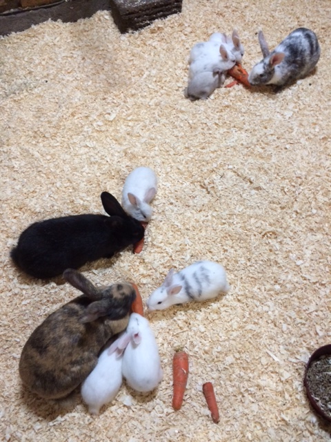 Nu sitter det 4 stora honor och 9 bebisar på 6 kvadratmeter yta. det borde vara lugnt i vinter med den ytan. Till våren funderar vi på att ha en stor kaninsäker bur till alla honorna.