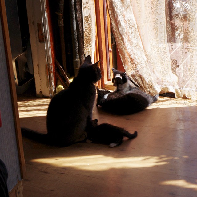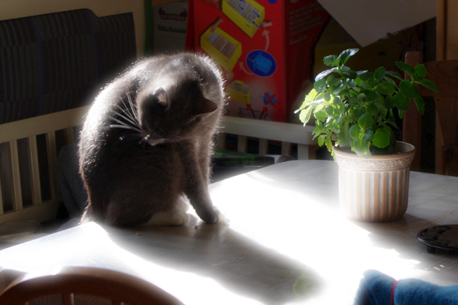 Idag var det så dags igen för kattjakt. Honan och Smee har lärt sig hoppa över skivan som sagt och jag tänkte att det får vänta tills Teskedspappan kommer hem från ånglokskonsultandet innan vi byter skiva. Det gick då inte, så jag fick ta skivan i dörren i köket och sätta däruppe istället. Börjar i och för sig att bli dags att lära Hannes att man badar inte i Selmas vattenskål och inte heller i toastolen….