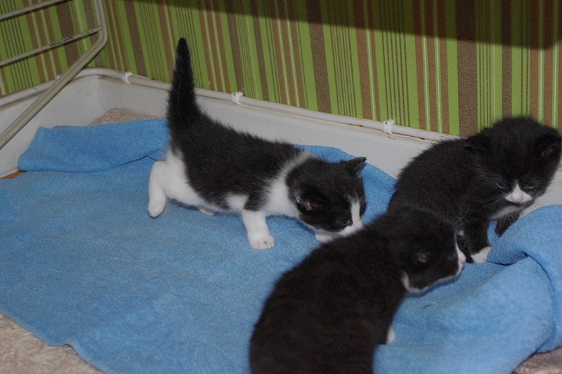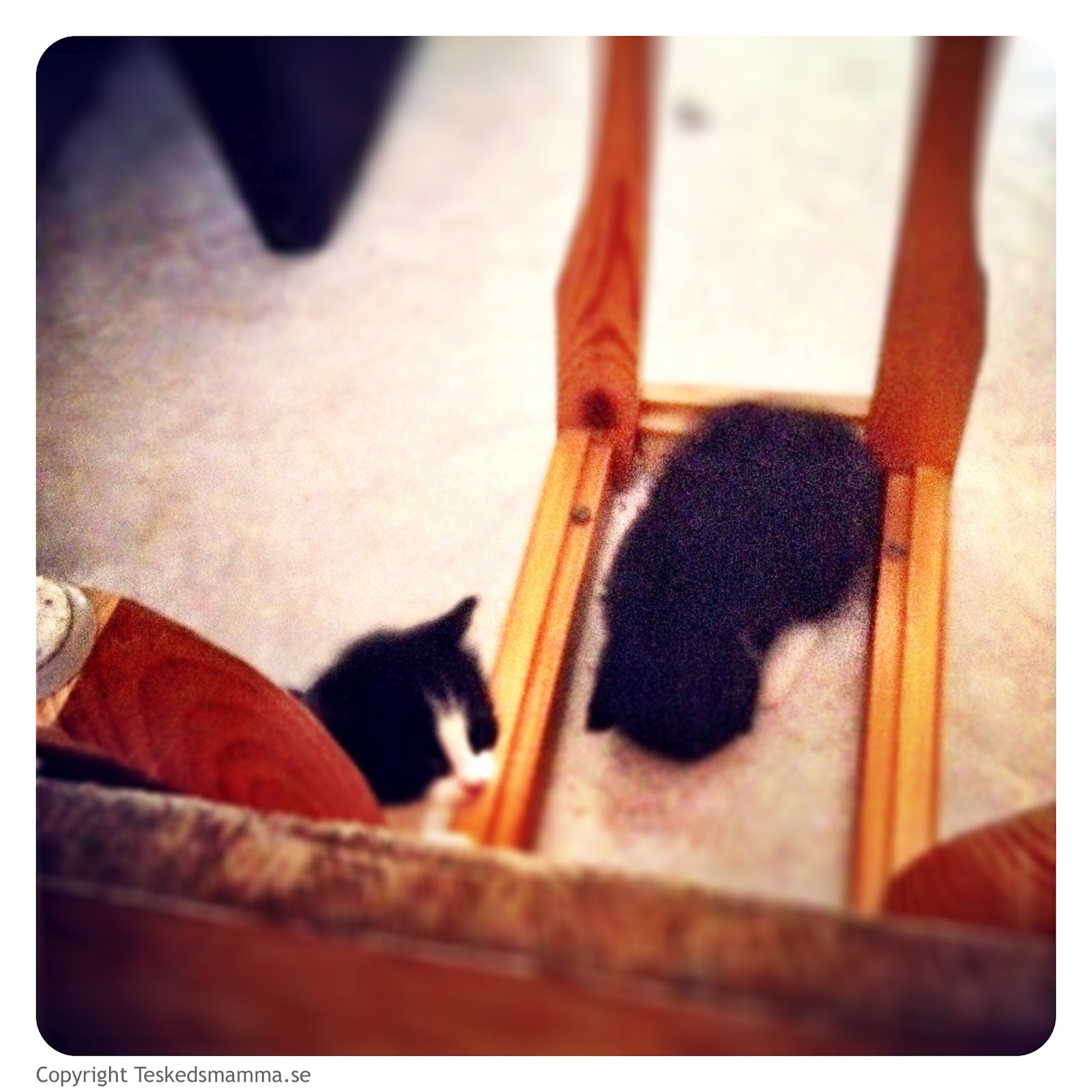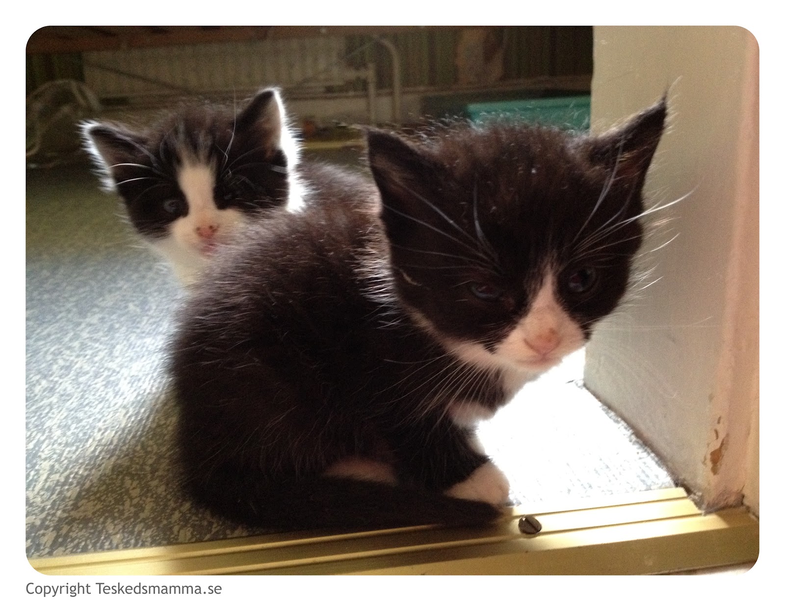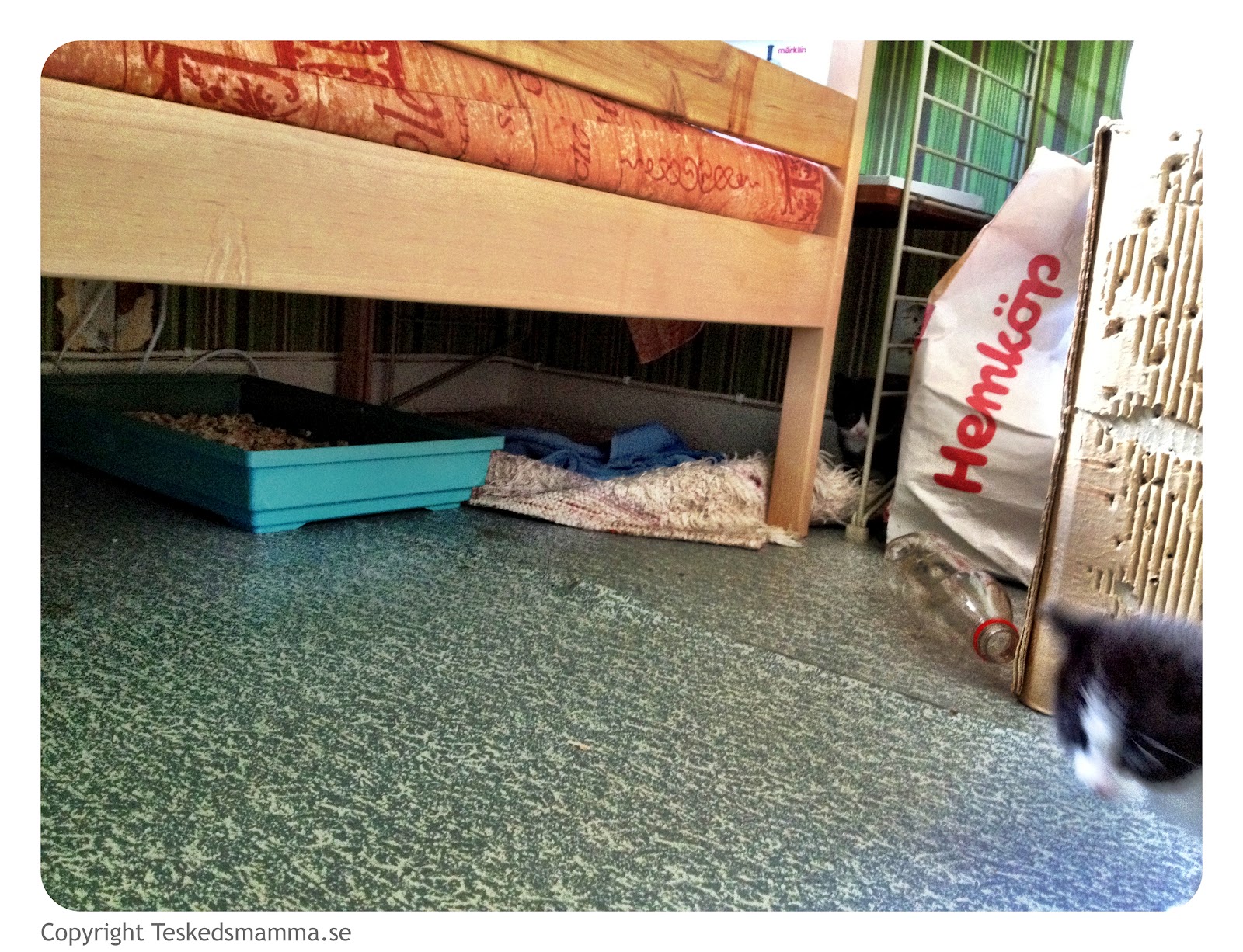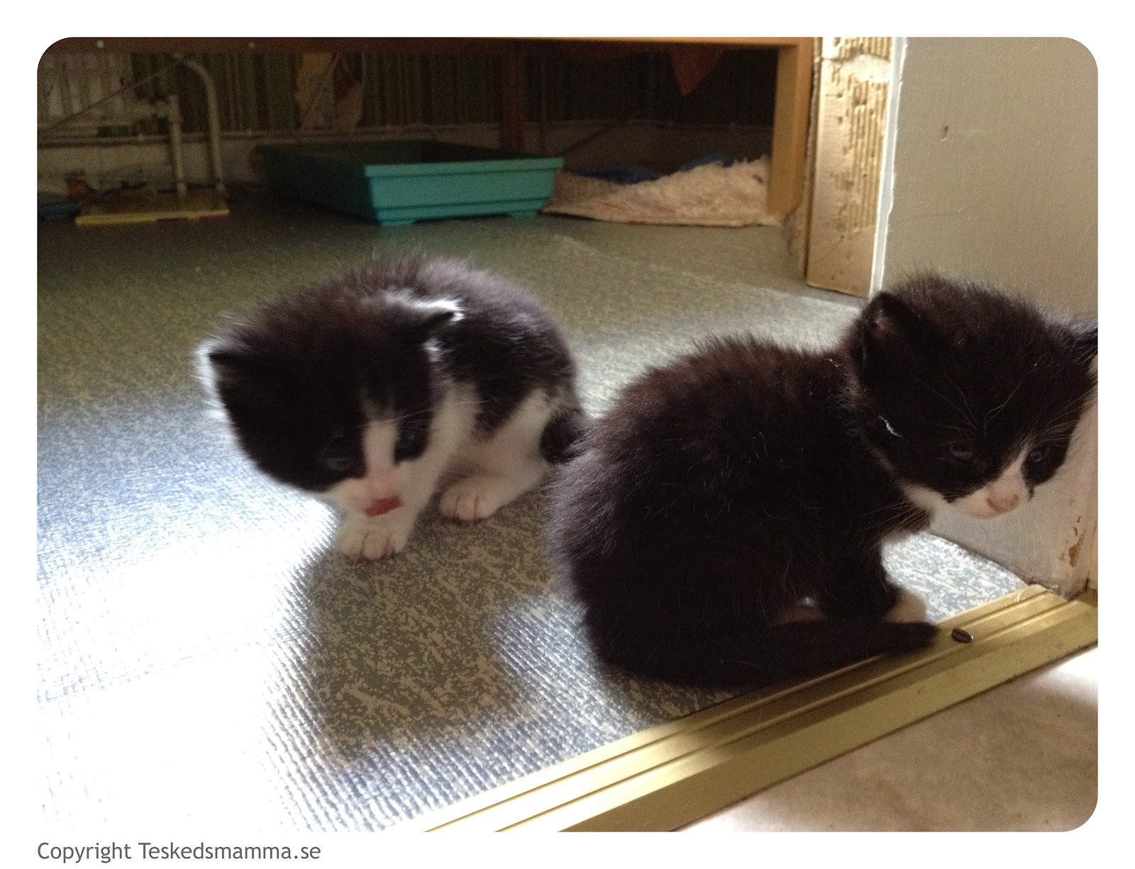 De små illbattingarna är 4½ vecka gamla och har sprungit runt i rummet däruppe i någon vecka. De lärde sig häromdagen att hoppa över den hylla vi hade ställt i dörren så vi har varit på kattjakt ett antal gånger.