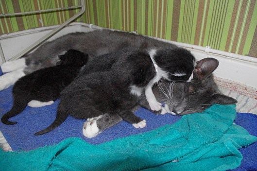 PimPim börjar allvarligt tröttna på kattungarna nu…. Jag hoppas Smee kommer åka till sin nya familj snart, han väger redan 1,6 kg och är 2/3 av PimPims storlek.