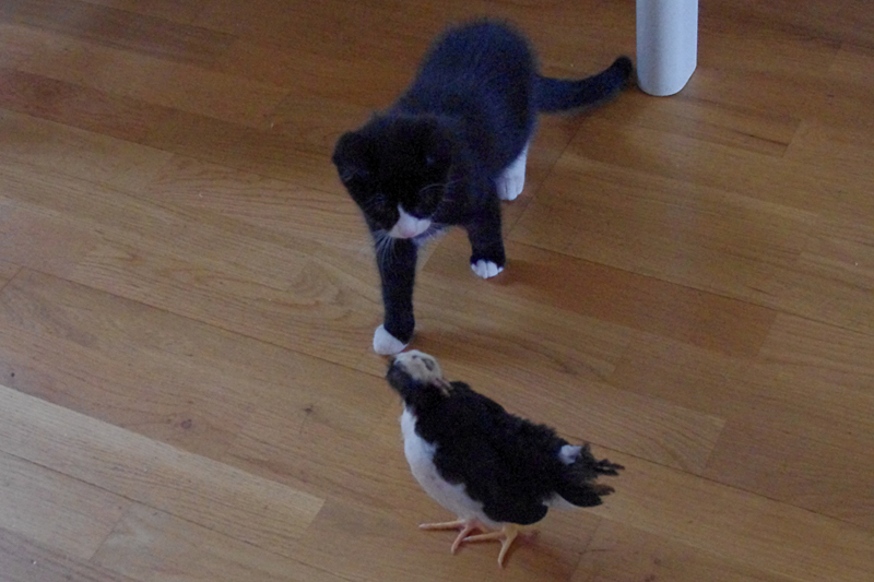 Kattungarna är väldigt nyfikna på Ettan (Orusthöna) men Ettan har en strategi, springer fram till kattungarna och hackar dem i huvudet. När Ettan kommer i närheten backar numera kattungarna…