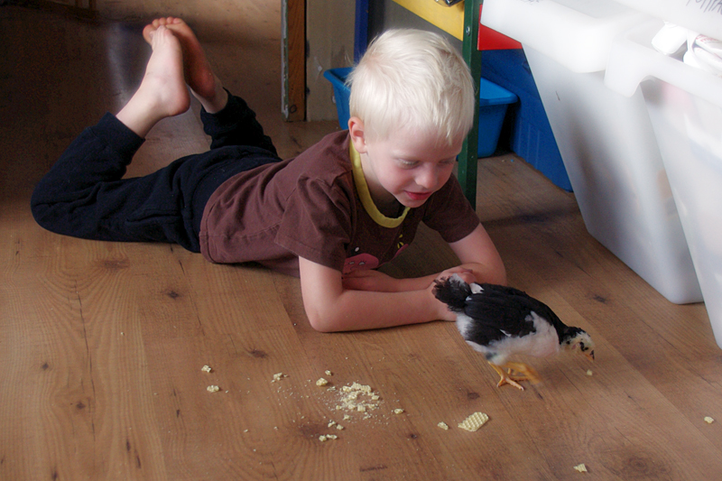 Det känns som ett privilegium att kunna ge ungarna sådan här djurkontakt under uppväxten. Hur många barn sitter på köksgolvet och matar kycklingar?