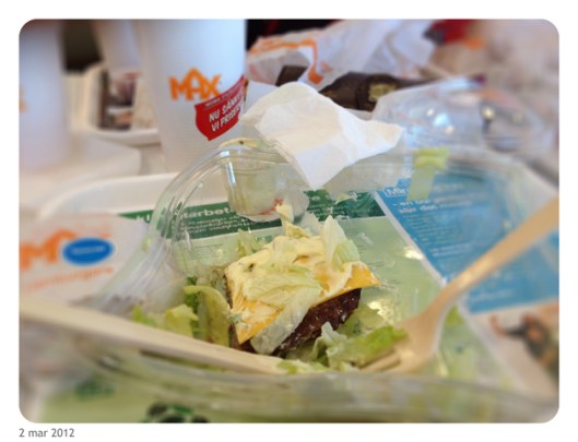 Ett halvt kvarter senare var det dags för nåt att äta. Grekisk Sallad till mig och Pastasnäckor till Hannes. Här var Hannes en tjuv! Han fick låna skeden jag matat honom med, att leka med medan jag åt färdigt och gömde den under madrassen! Så den har vi med oss hem från Gotland *host*