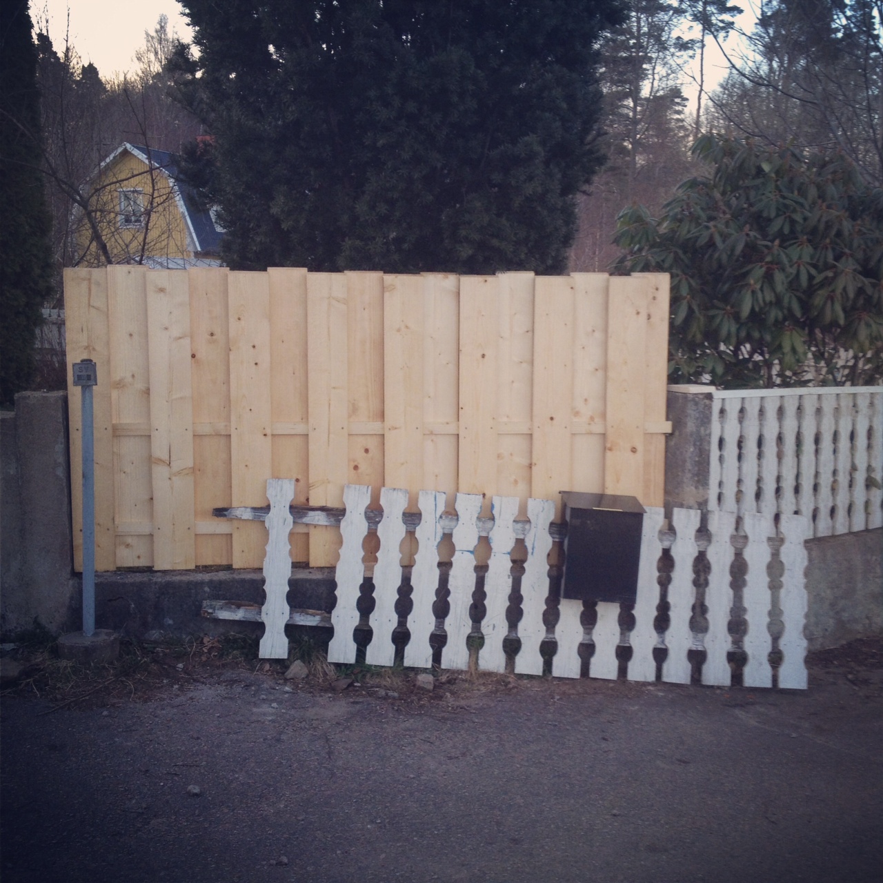 Ni ser ju hur gamla staketet ser ut, och det nya hoppar inte Selma över heller och fastän planket inte är helt kompakt så ser hon ändå inte folk som går förbi på gatan. Problemet nu är bara om vi ska sätta plank över stolparna, gjuta upp dem i höjd med resten av planket eller hänga lyktor i dem? Det kommer nämligen en planka ovanpå staketet också….